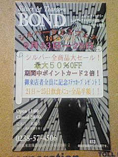 毎度です。今年もこの季節がやってきました!「925フェアVOL2」9月25日にかけて当店BONDではお客様感謝セールを今年も開催しますぅ〜!期間は9月23日から25日まで!し・しかし20日から25日まではなんと、飲食メニュー全品半額でやっちゃいます(^^)今回もいろいろな特典を準備して皆様のお越しを心からお待ちしております。どうか神様、晴れてくれぇ〜!!