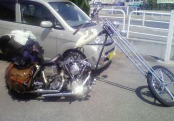 長野から東北ツーリング中のショベルのロングフォークのバイカーさんが