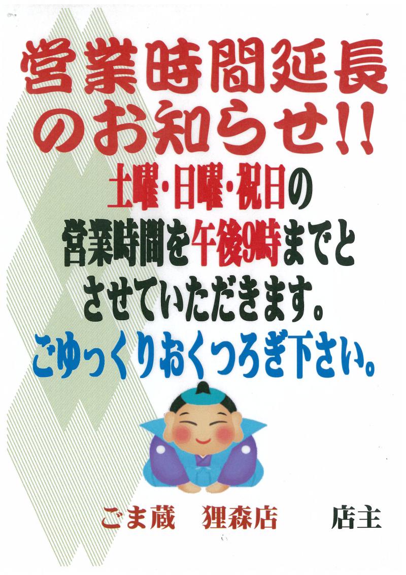 ごま蔵狸森店から「営業時間延長のお知らせ」です