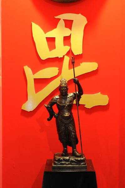 以前の毘沙門天レリーフに加えて毘沙門天像が加わりました。兜跋毘沙門天です。なんだか玄関前が引き締まったような感じがいたします。北方からお客様を見守っています。