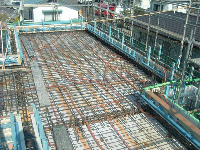 2階の天井(屋上の床)の配筋が終わりましたので、いよいよコンクリートを流し込みます。