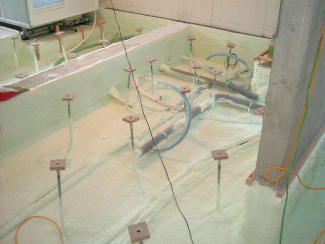 束を立てたら、基礎の内側をウレタン断熱吹付工事をしていきます。