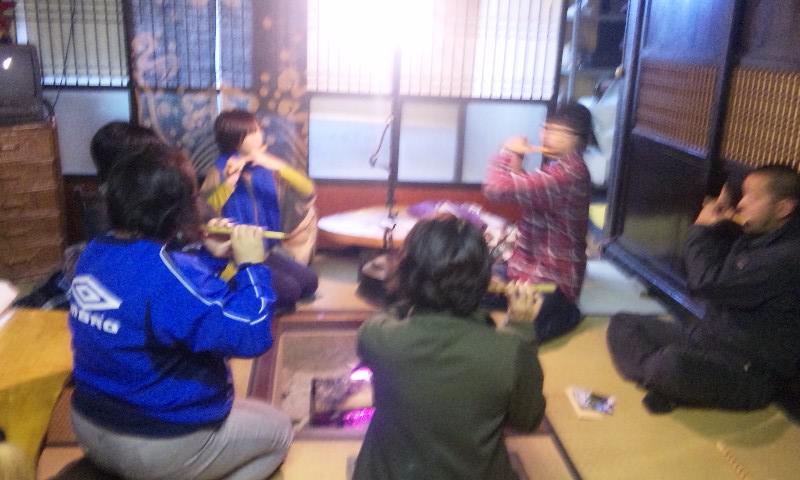 囲炉裏の煙に燻されながら、笛のお稽古を致しました