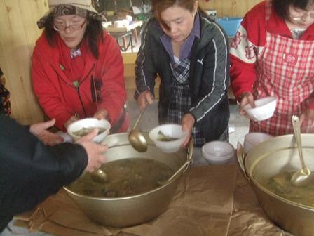 ▼昼食時には山菜汁のふるまいが