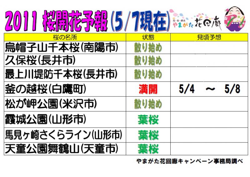 ▼やまがた花回廊エリアの桜開花情報 5月7日(土)現在