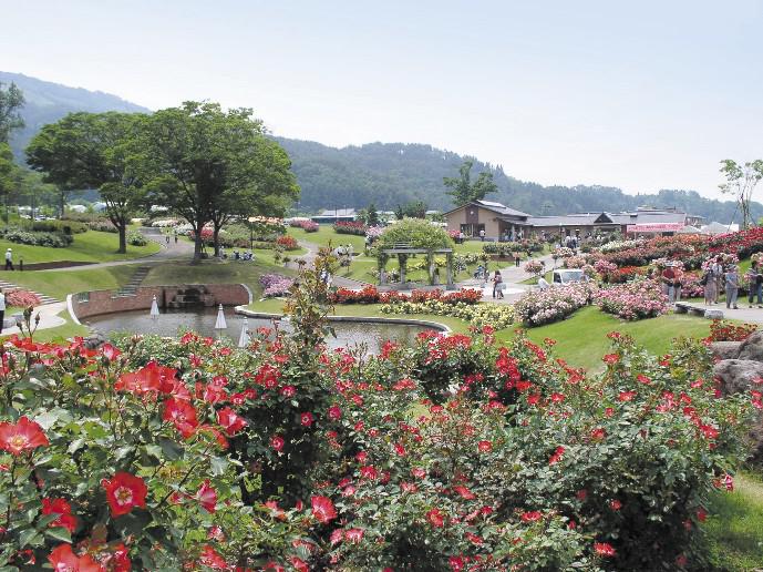 ・山頂から村山市内を一望した後は、東沢バラ公園へ
