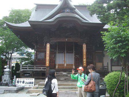 この地域の歴史などを聞きながらまち歩き。遠くに見えるのが、映画「おくりびと」の撮影が行われた上山コンチェルト館