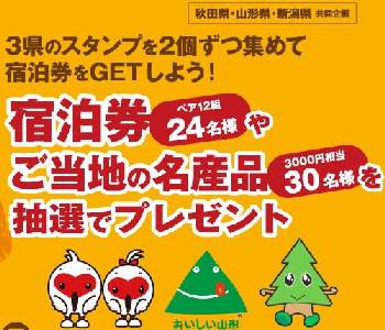 秋田・山形・新潟3県のスタンプを各県2つ・合計6つ集めると、ペア宿泊券や