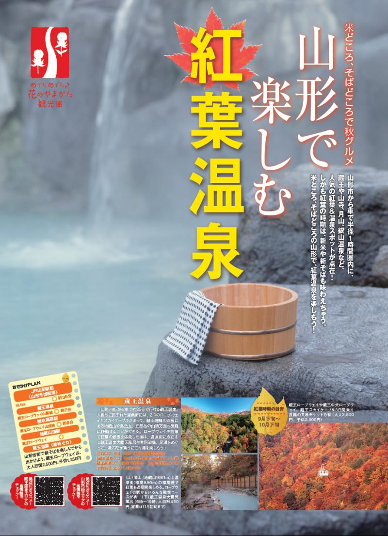 村山地域7市7町で構成する「めでためでた♪花のやまがた観光圏推進協議会」では、紅葉・温泉・食をテーマとした誘客を図るため、じゃらん11月号に圏域内の情報を掲載しています。