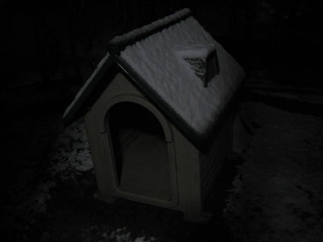 寂しい無犬の小屋にも雪が。