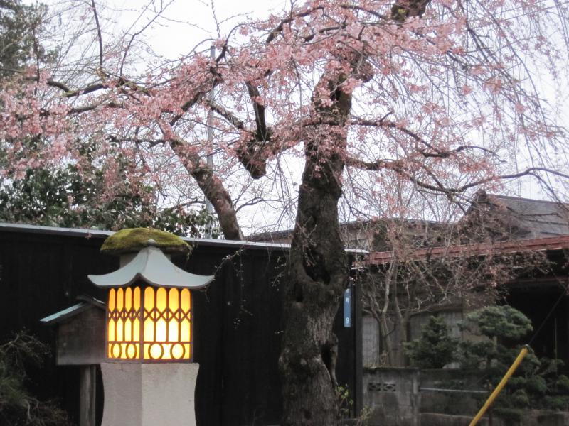 (1)長井市大町、雪舟院入り口の「撞木(しゅもく)橋」たもとにあるシダレザクラ。(写真)
