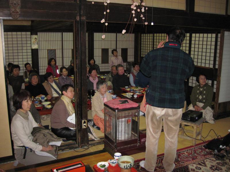 昨日は冷たい雨の中、烏帽子山公園から久保桜までバスでまわっていただきました。写真は夕食の「獅子宿」で、金子俊郎さんのオカリナ演奏を聞いていただいているところです。せめて音楽で満開の桜を味わっていただきたいとお願いし、快くお引き受けいただきました。