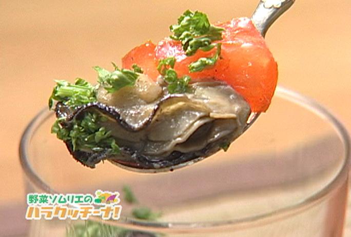 Cガラスのコップのような器にトマトのみじん切り、カキ、パセリの順に盛り付ける。