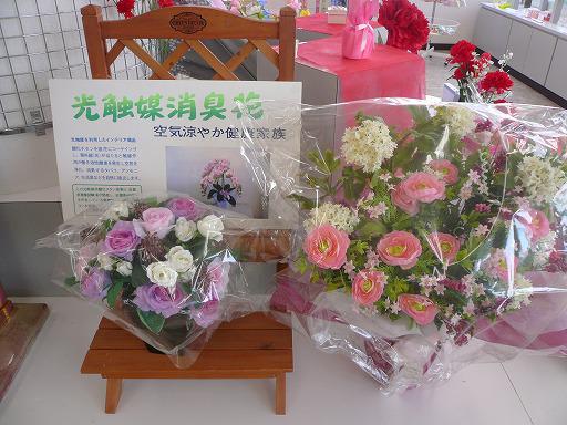 さて、日頃の感謝をこめた母の日ギフトはもうお渡しになりましたか?万が一、まだ・・・という方は当店にお越し下さい。写真の「光触媒消臭花」もご用意しております。