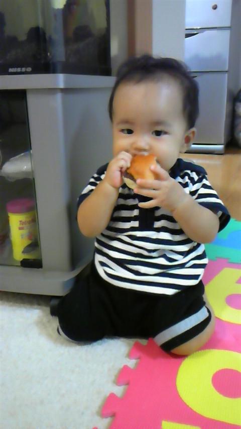 写真は夕方、買い物から帰ってきて、買ってきたパン見つけて欲しがったので、あんパンかぶりついてます(笑)