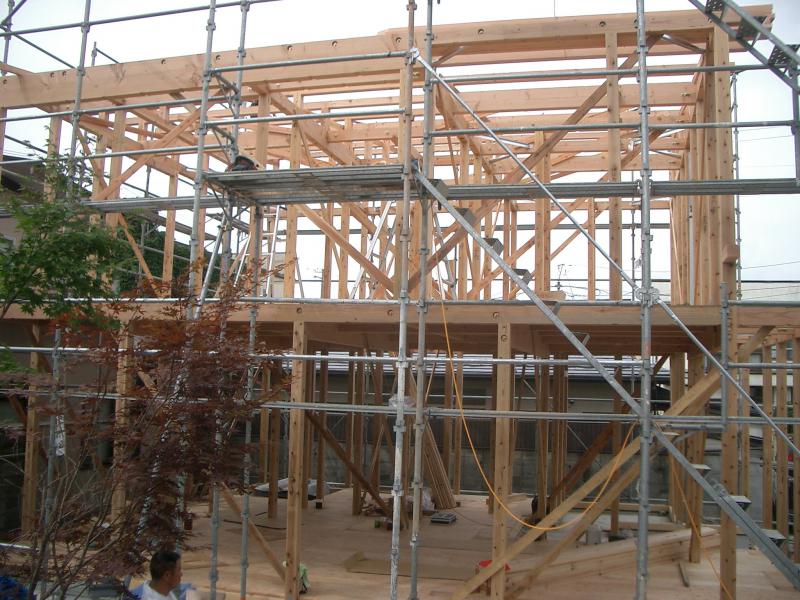 じつは。。もっと進んでまして今外部のスジカイ替わりとなるダイライトを施工中です。すっかり「家」らしくなりました。現場はとても閑静なところでとても中心部とは思えないような感じです。羽が透明なセミがたくさん木にとまっていました。(昆虫には詳しくなくてすいません)
