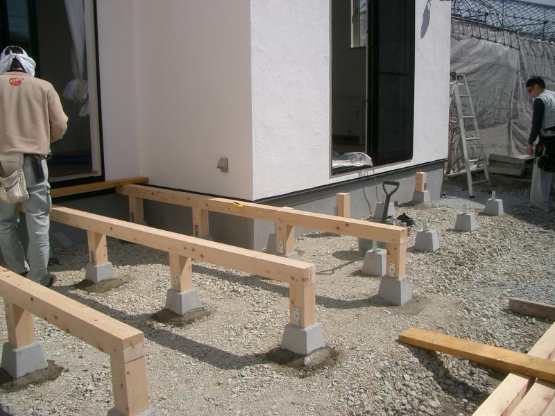 今回の写真はウッドデッキの製作風景です。大工さん製なので頑丈です。ちょっとごつい感じがするかもしれませんがそこが◎!