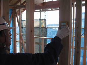 躯体検査は基礎・木材材料・アンカーボルト・土台・床束・柱・体力壁・床組・小屋組・金物などです。この写真は柱の含水率を測定しているところです。乾燥状態良好。異常なし。