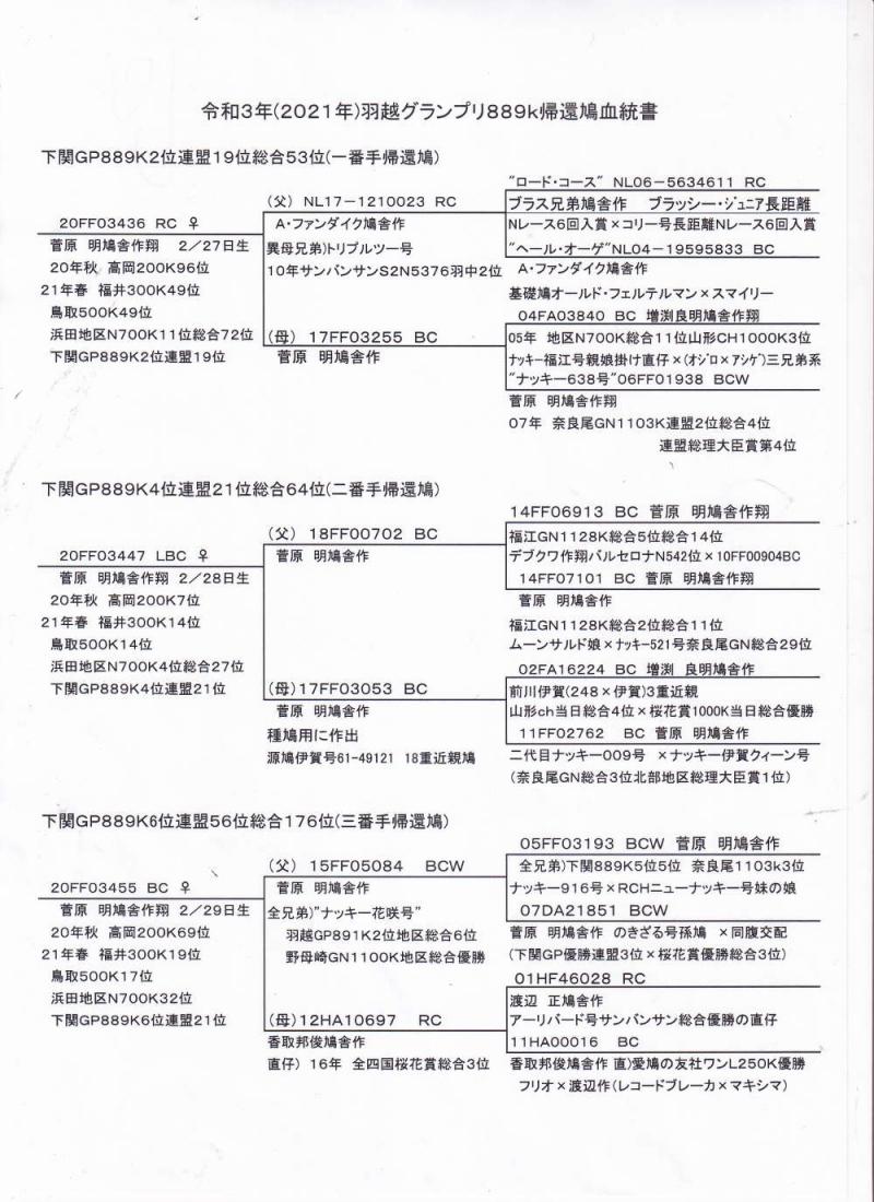 「羽越GPレース記録鳩くん」の血統書を添付しますので是非見て下さい。