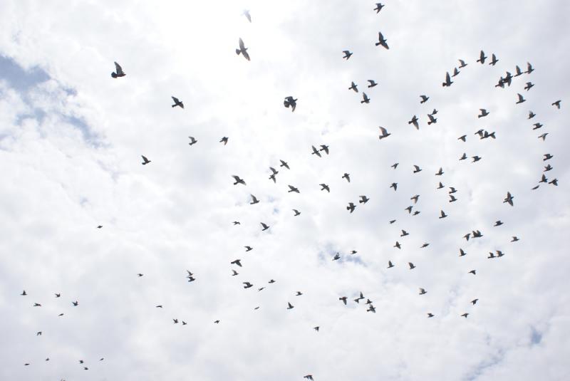 もう一度飛んで貰おうと「釣竿」を振り回すと鳩くん達は飛び立ったので何羽下りていたのかとザット推測すると「80羽位」の半分弱でその他の鳩くんは「遠征」から戻っていないようです。