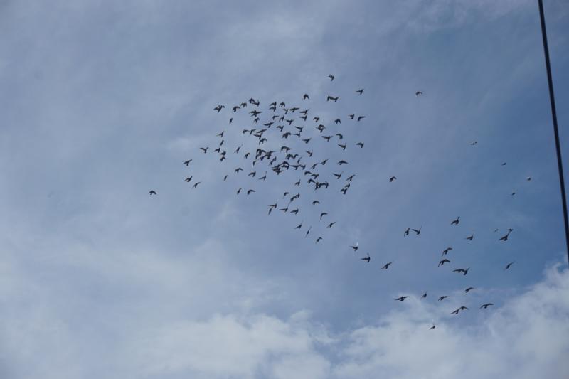 鳩舎の屋根を見ると「10羽位」の鳩くんが身をかがめてた片隅で呆然と空を見上げていましたがのこりの鳩くんたちは必至で飛んでいました。