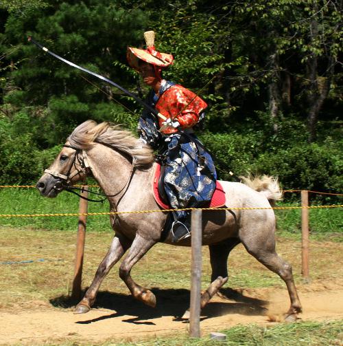 流鏑馬とは、疾走する馬上から的に矢を射る儀式。