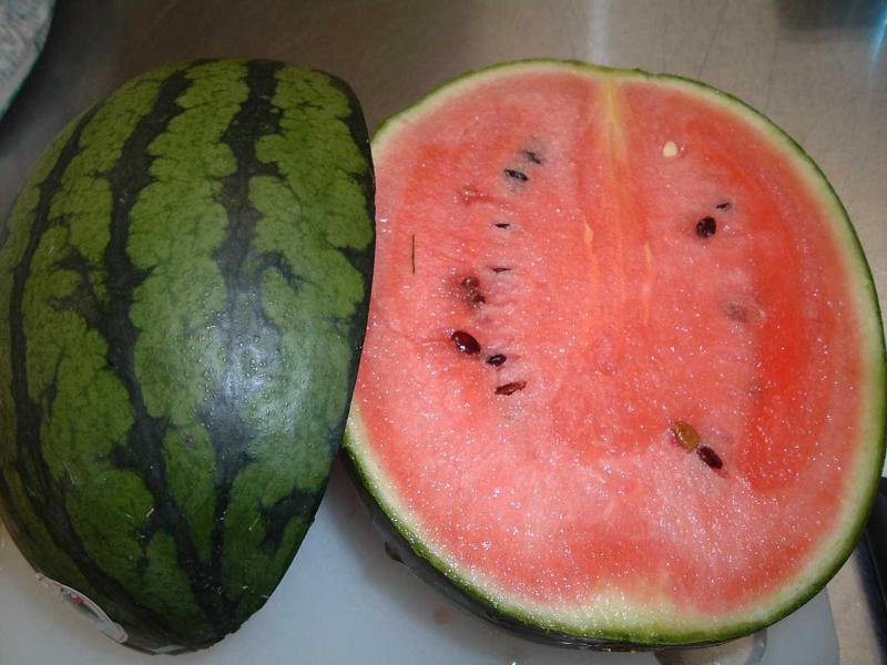 スイカは皮の線に沿って切ると、種にあたらずに
