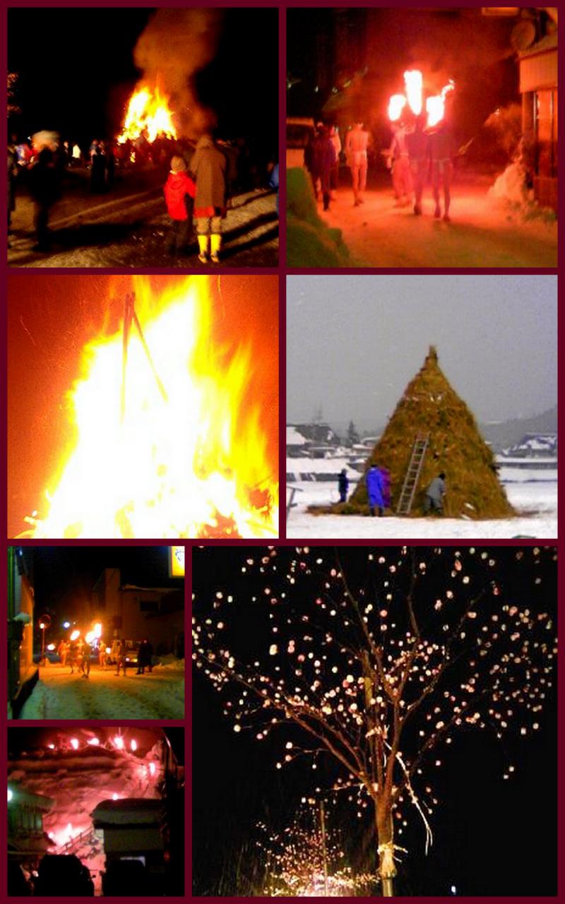 夕暮れと共に雪原の会場に観衆が集まり、篝火が焚かれた会場は幻想的なムードを醸し出します。やがて、下帯姿の鳥追いの若い衆が松明をかざし会場に入りお柴灯に点火し安全祈願を奉じ、火の勢いが盛んになる頃まちへ駆け出して行き、その年にお祝い事のあった家々を回ります。特にこの地方独特の『鳥追い』の行事を織り込み、動と静を巧みに演出しています。