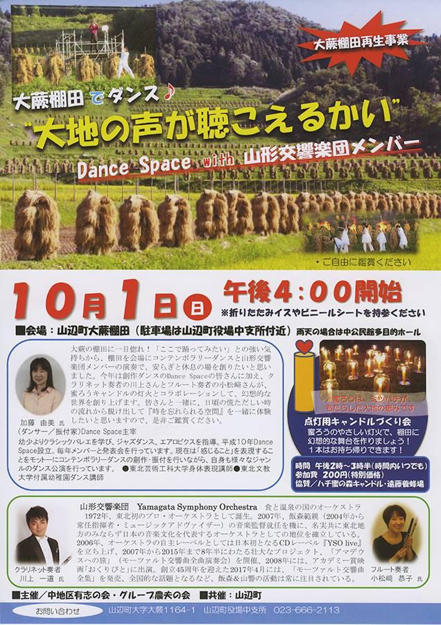「Dance Space」(加藤由美代表)のコンポラリーダンスの公演が、今年も山辺町大蕨の棚田を舞台に行われます。公演前に、夕暮れの会場を照らす双子キャンドル作り会を開催します。小さな双子キャンドルの、1本は舞台となる棚田に灯し、もう1本は持ち帰れます。多くの皆様のご参加をお待ちいたしております!