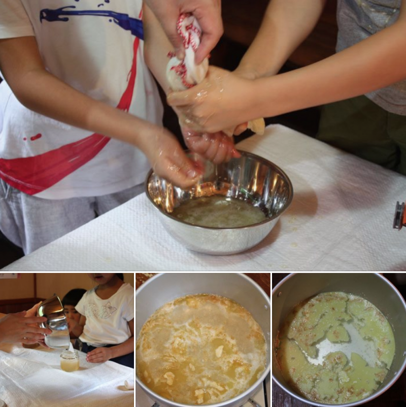 昨日は夏休み子供向けワークショップを開催しました。養蜂場でミツバチ🐝の巣の中をのぞいたら、自然に作られた蜜巣を使ってハチミツしぼり! 養蜂家が今でも採蜜のことをハチミツ搾りと言ってしまうのは、山蜂の蜜を昔はこうして濾していたから。今回も感触と甘さ😋に大歓声が上がりました。布に残った巣を鍋で煮て蜜ろうになるところも見ていただきました。来年もまたやりますね😉