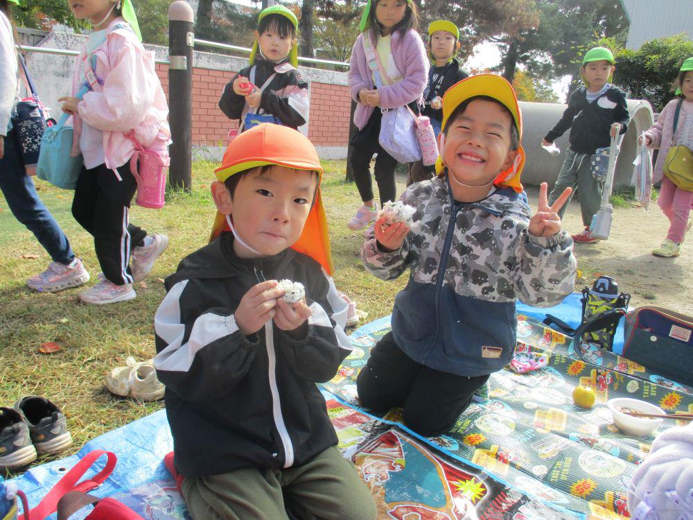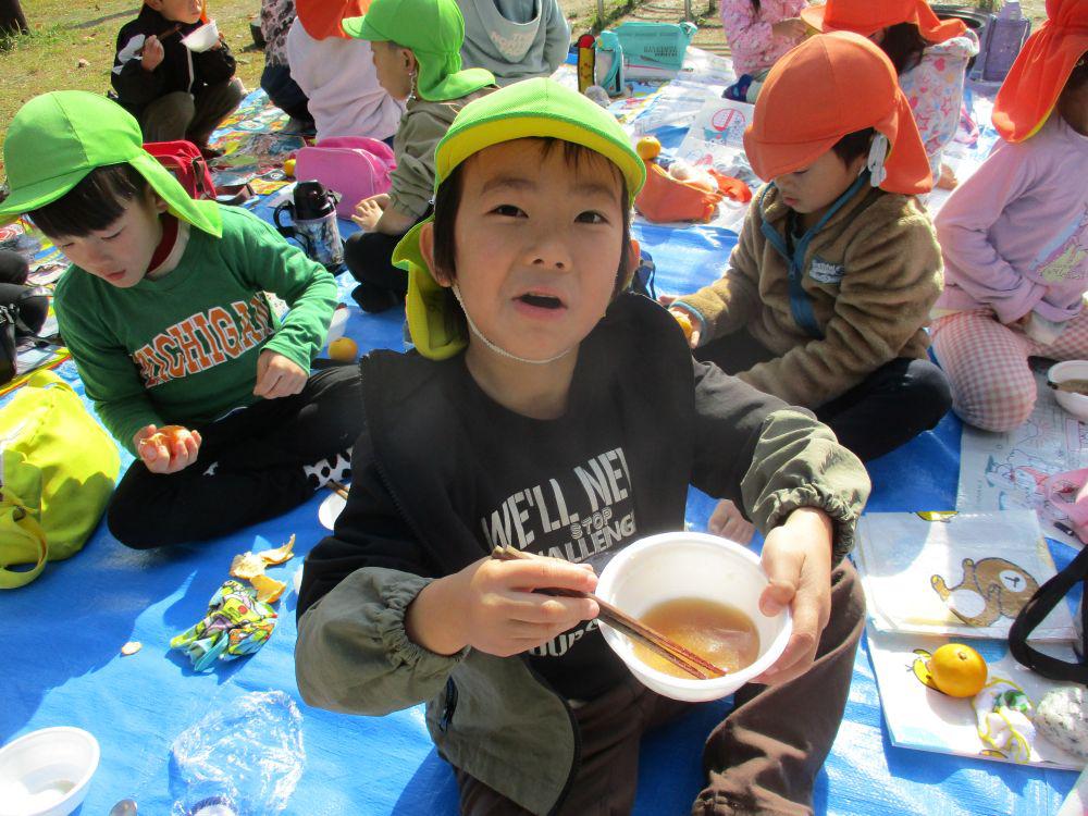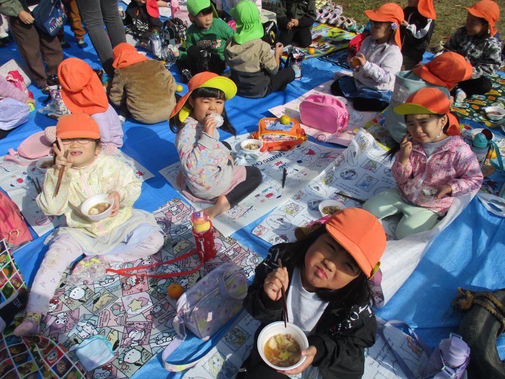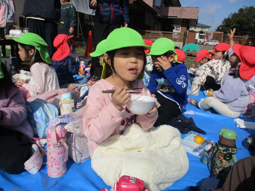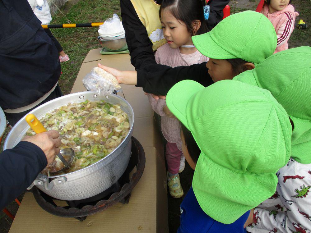 毎年恒例芋煮会を今年も園庭で行いました。前日まで雨が降っていてどうなる事かと思いましたが、当日は晴天の下みんなでおいしくいただきました。幼児組さんにはこんにゃく千切りや、しめじほぐしから食材を鍋に入れたり調味料で味付けなどのお手伝いをしてもらいました。「おなかすいた~」といい匂いに食欲も倍増。鍋が空になるほど喜んで食べていました。