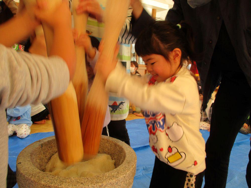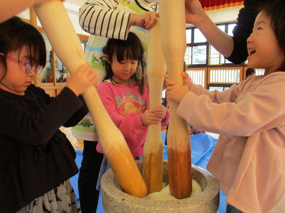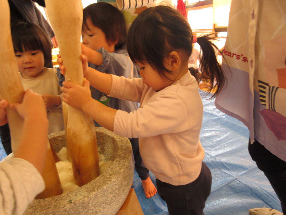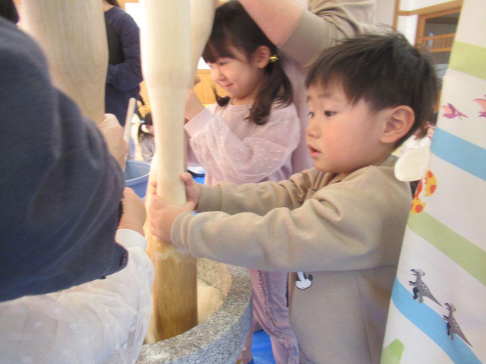 12月26日にみんなで臼と杵で餅つきをしました。保育者が補助をしながらの餅つきは簡単そうに見えて結構力が入ります。年長組さんだけは「一人でやってみる」と果敢にチャレンジし力強く餅つきをする姿が頼もしく見えました。つきあがった餅で神様にお供えする鏡餅を作り保育園の中に飾りました。