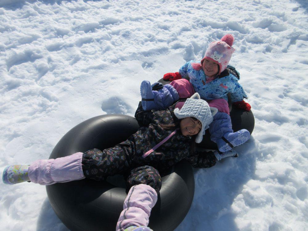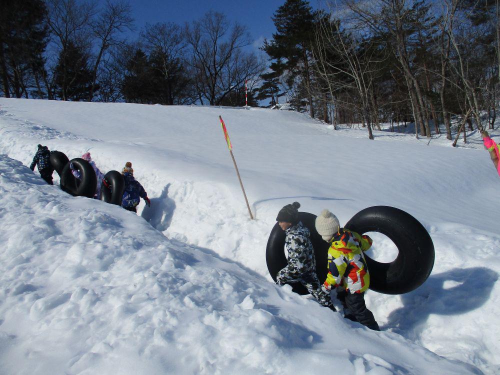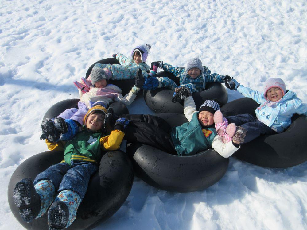 2月5日年長組さんが飯豊少年自然の家・スノーランドでチューブ滑りを体験してきました。保育園でのそり滑りとは違った、チューブを使っての滑降はダイナミックで、一人で滑ったり友だちや保育者と連結滑りを歓声をあげながら満足するまで楽しんできました。滑り終えた子どもたちは口々に「楽しかった~」「また来たい」と笑顔でした。