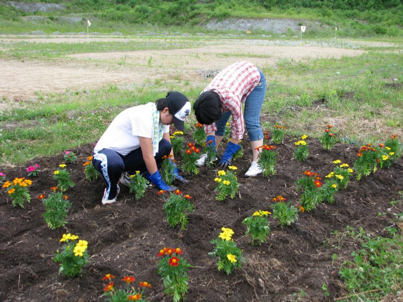 9時30分から花植えを開始。「二人にまかせるから、色とりどりに植えてね」とお願いすると、「はぁい!。頑張りまぁす。」と元気な声で返事をし、黙々と作業にとりかかりました。さすがに若い。動きが早い。俊敏です。