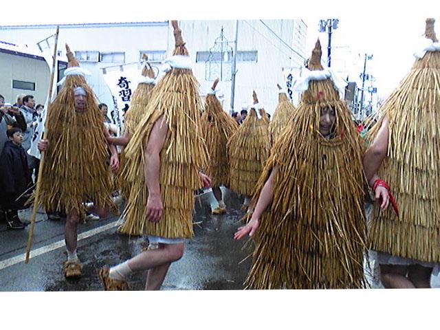 みの姿の「カセ鳥」達が威勢のいい掛け声とともに街の中を練り歩きます。