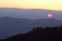 白布峠の夕陽の写真です。連なる山々と夕陽が神秘的ですね。昔は山は神々が住まいし所とされ、現在でも各地に霊山があります。