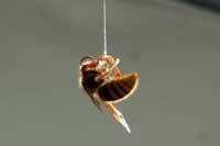 スズメバチがクモの巣にかかり、糸でつり下げられています。凶暴なスズメバチでも、この姿を見るとかわいそうですね。昆虫の世界は弱肉強食です。弱いものは強いもののために生きているようなものです。