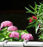 アジサイとキョウチクトウが並んで咲いています。お互いに引き立てあっているようできれいですね。