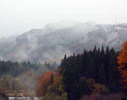 昨日、初雪が降りました。午後にはやんだのですが、少し高い山は雪景色となってしまいました。紅葉に色づく木々も突然の雪に驚いているのかもしれません。