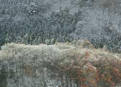 雪の降らない日が続いていたのですが、昨日から雪が降り始めました。山の木々に雪が舞い降り、きれいに包み込んでいます。雪に覆われた木々もきれいですよ。