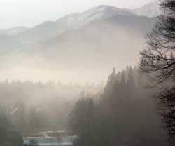 小野川温泉にも昨日から雪が降り始めました。今日の写真は雪と霧に覆われた小野川温泉の景色です。