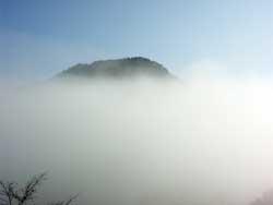 小野川温泉から見える月山の写真です。この時期は雪が降らず、星空のきれいな日ほど冷え込みます。太陽が昇り急に温度が上昇すると深い霧に覆われることがあります。目の前がすべて霧の覆われ月山の頂上しか見えない日でした。