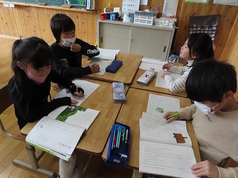 2年生は登場人物と話の流れを表にまとめる授業 グループで相談しながら表に書き込んでいきます。