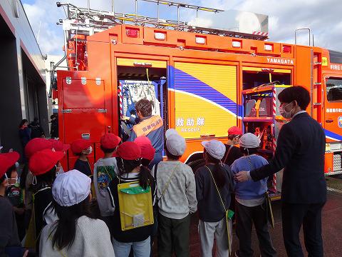 3年生の社会科見学 西置賜行政組合消防本部に見学に行きました。火災から命を守る仕組みや、消火活動についての説明、通報のシステムなどを学んできました。安心な暮らしは、夜も寝ないで待機している隊員のみなさんのおかげだということを学んできました。