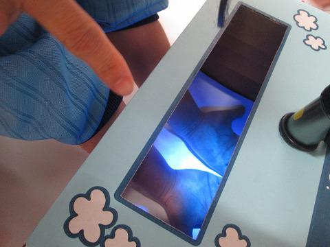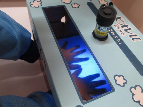 そこで、手洗いをしっかりとしてほしいということで、ピカピカ運動。手にクリームをつけて、手洗いをし、残りがないかブラックライトで点検します。ちゃんと洗えていましたか?