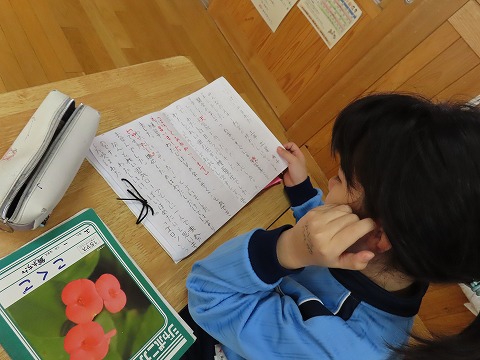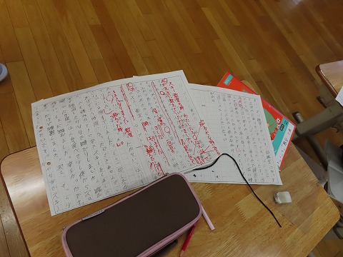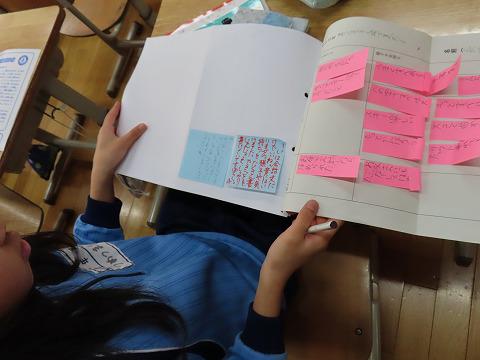 先生からの添削も一人一人細やかで、子ども達をそれを見ながら自分の作文を修正していました。修正した作文はみんなで読み合い、感想を付箋紙に書いていました。