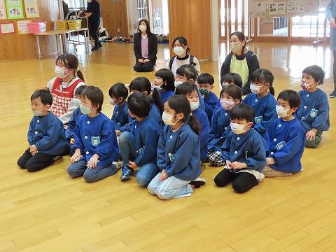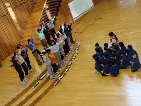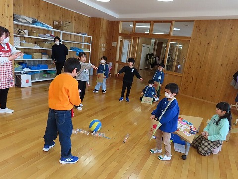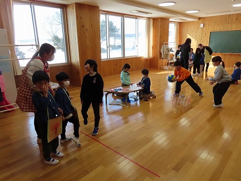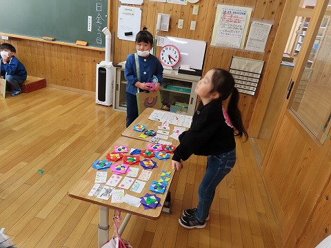 初めに、1年生からの発表があり、その後、1年教室と生活科室で楽しい遊びで交流しました。あと、2カ月で1年生ですね。1年生は2年生となり、一つお兄さん、お姉さんになります。