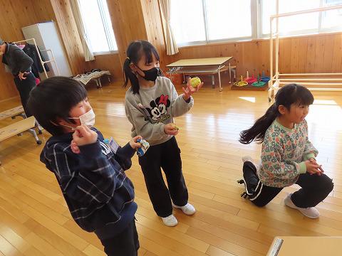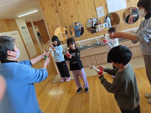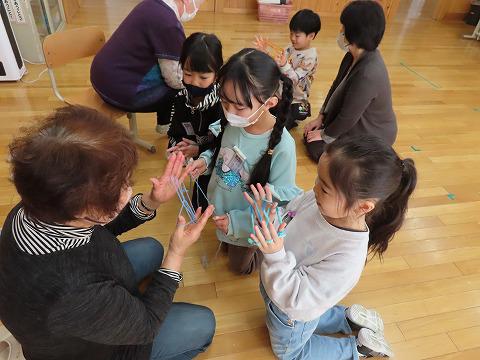 1年生では昔遊びで、多くのボランティアの方々においでいただき、子ども達に遊び方などを教えていただきながら、楽しく交流することができました。