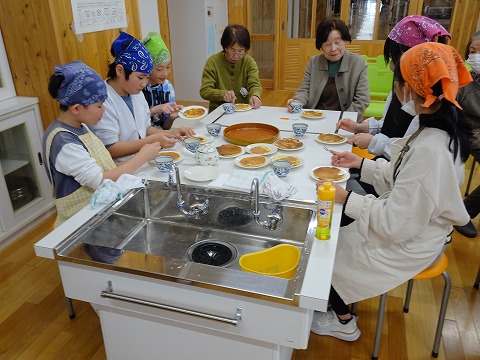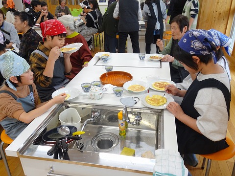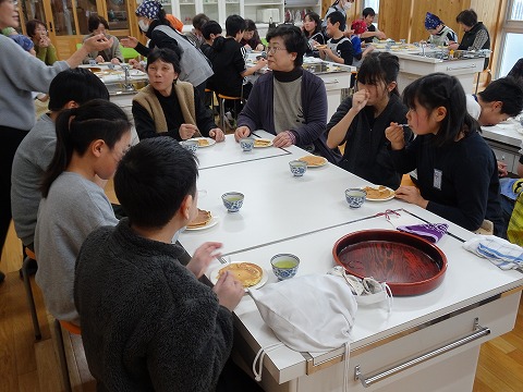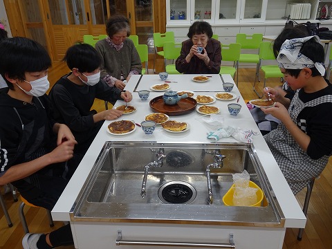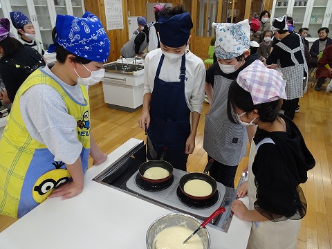 2校時~5年生の家庭科で、ボランティアの方に感謝する会を行いました。家庭科室でホットケーキを焼いてのお茶会です。