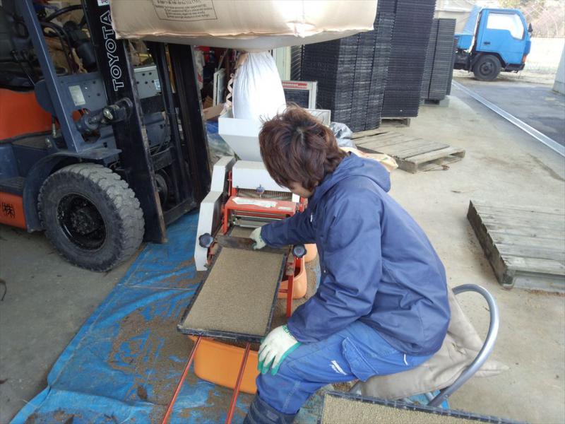 さて、只今種まき準備のため、苗箱に床土(種をまく下地)を入れておく作業をしています。農家によってやり方は様々なようです。